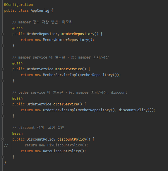 - @Configuration 설정 정보에 @Bean을 적고, 객체를 생성하고, 주입할 대상을 일일히 적어줌