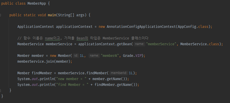 - 이때 기본 조회 전략은 타입이 같은 Bean이다 → getBean(MemberRepository.class)처럼