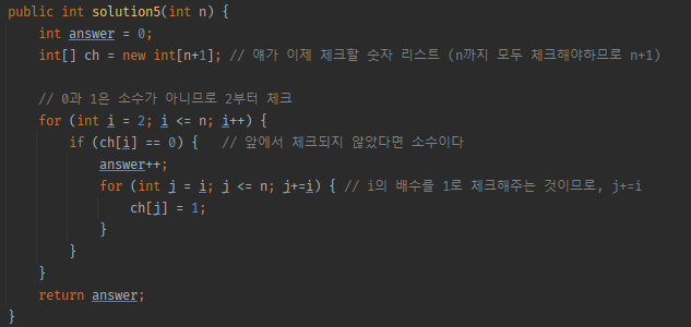 앞선 반복문에서 1로 체크되지 않았다면 소수가 맞기때문에 answer값을 올려주면 끝!
